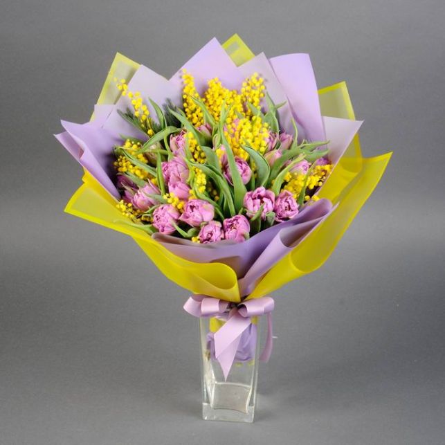 Виготовлений з найкращих сортів квітів, букет вражає своєю гармонією та кольоровою гамою. Вибір квітів здійснюється з особливою турботою, щоб кожен бутон виглядав, наче творіння природи. Яскраві троянди, ніжні лілії та ароматні тюльпани створюють неперевершений ансамбль.
