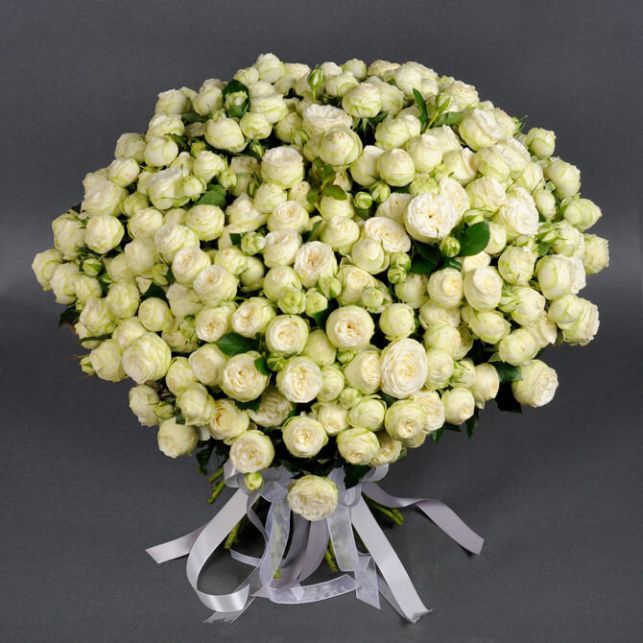 Цей вишуканий букет складається з 51 піоноподібної троянди спрей Сноу Ворлд, вирощених безпосередньо в нашому саду. Ці троянди, ніби крижані квіти, подарують вашому приміщенню атмосферу чистоти та ніжності.