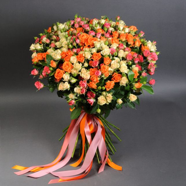 Наш "Букет із 51 троянди спрей мікс" – це поєднання гармонії кольорів та свіжості, що вразить ваше оточення. Троянди, використані у букеті, вирощені з любов'ю та турботою, що гарантує їхню довговічність та неповторний аромат.