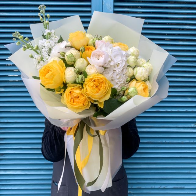 Букет з гортензіями та трояндами Лунар Рапсоді від магазину Камелія - це витончена композиція, що привертає увагу своєю елегантністю та свіжістю квітів. У нашому магазині ми пропонуємо тільки найвищу якість квітів, включаючи троянду Лунар Рапсоді, піоноподібні троянди Сноу Ворлд, гортензію, ранункулюс, матіолу, які створюють чудовий букет. Ми пишаємося своєю здатністю забезпечувати свіжість і тривалу якість квітів, які стануть окрасою будь-якого приміщення. Крім того, у нас ви знайдете великий вибір різноманітного новорічного декору, який допоможе створити особливу атмосферу в будь-який день святкування. Магазин Камелія завжди пропонує доступні ціни на наші товари, щоб кожен міг знайти ідеальний подарунок за помірною ціною. Покупка у нас - це шлях до якісних та унікальних квіткових композицій, які неодмінно подарують радість та святковий настрій!
