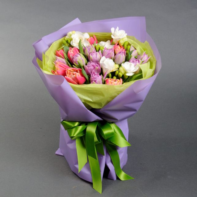 До складу букета входять тюльпани, фрезія