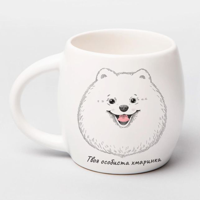 Шпіц на чашці хоче кави.