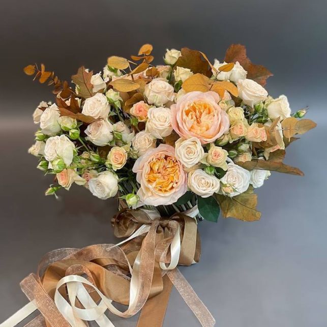 Троянда Олена спрей, троянда Софі спрей, троянда Санні дей, евкаліпт Синерея, куеркус, флористичний декор