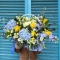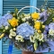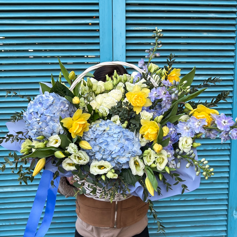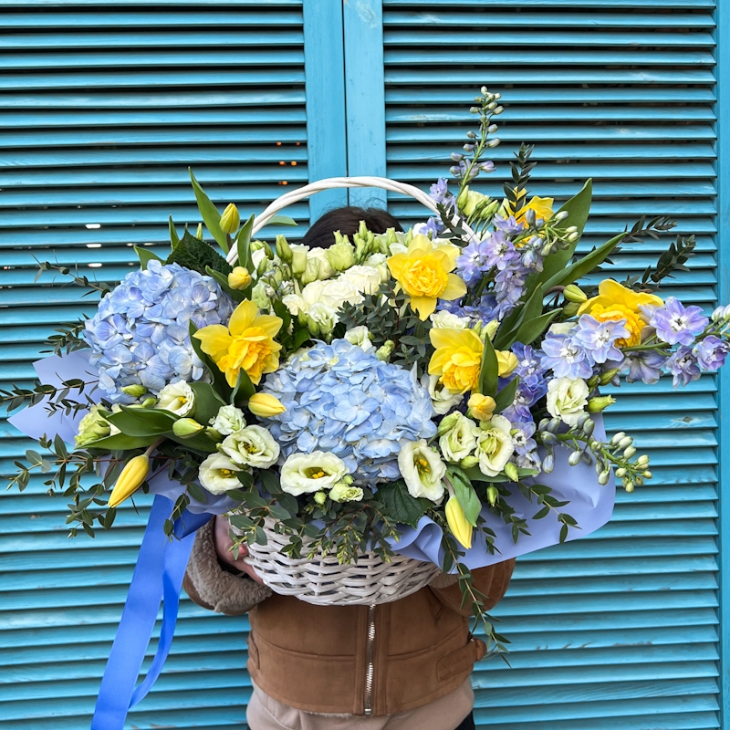 Гортензія, нарцис, дельфініум, еустома, тюльпан, піоноподібна троянда Сноу Ворлд, евкаліпт