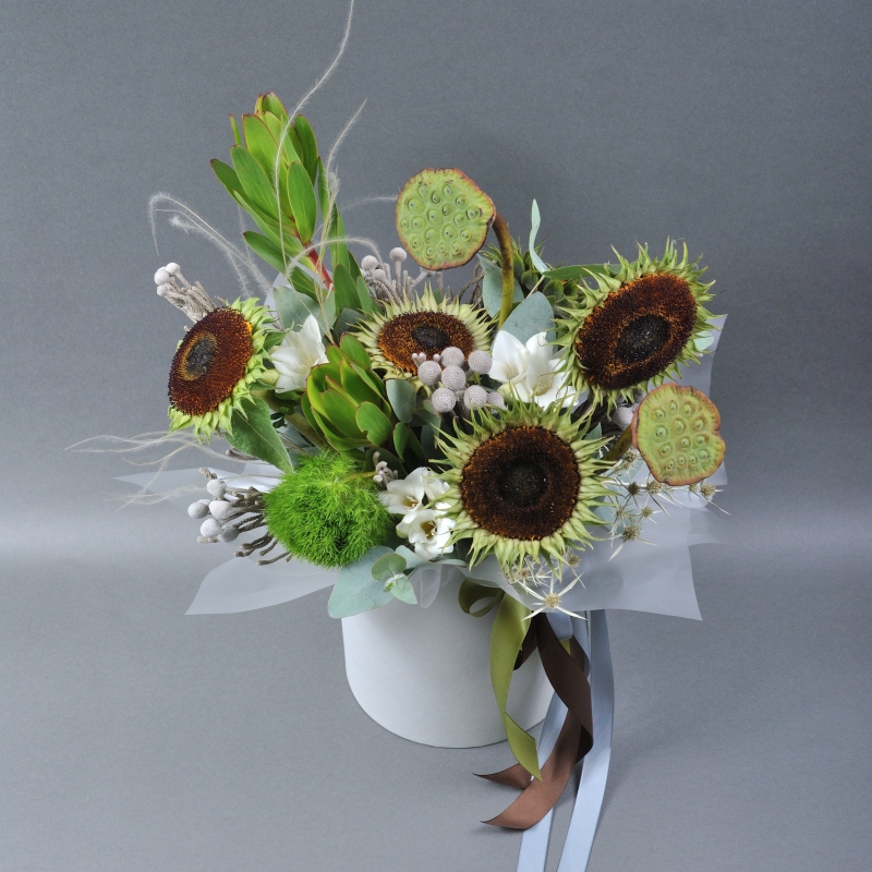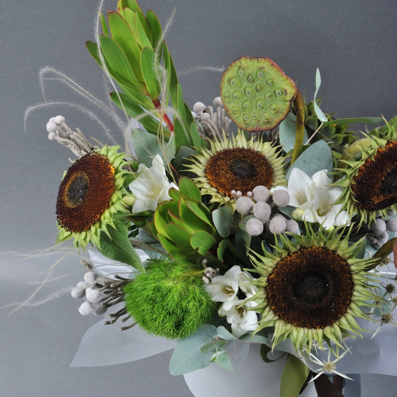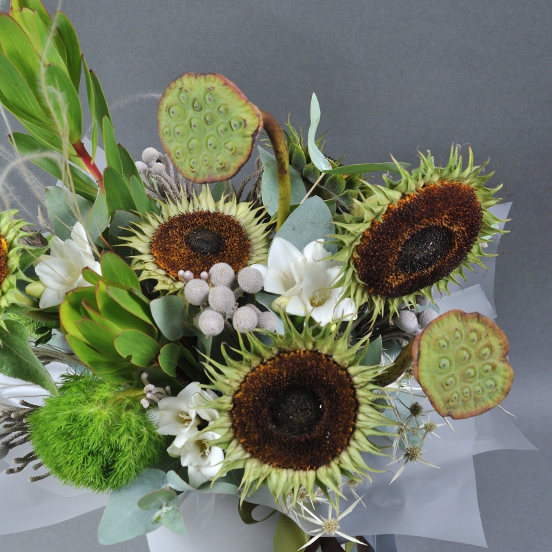 Сонях, Брунея, Нелюмбо, Діантус, Леукадендрон, Евкаліпт Синерея, Фрезія, Сухоцвіт Стіпа(Ковиль)