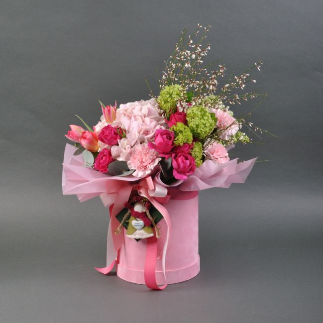Гортензія, вібурнум, бузок, дженестра геніста, гвоздика, тюльпан, троянда Річ Бабелс спрей, магніт гіпс лялька