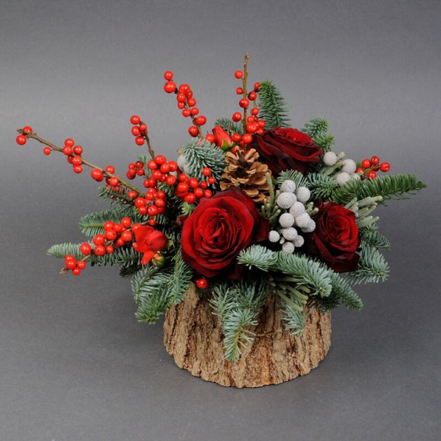 До складу композиції входить троянда Гран Прі, ілекс, брунія, хвоя, троянда спрей Ванесса