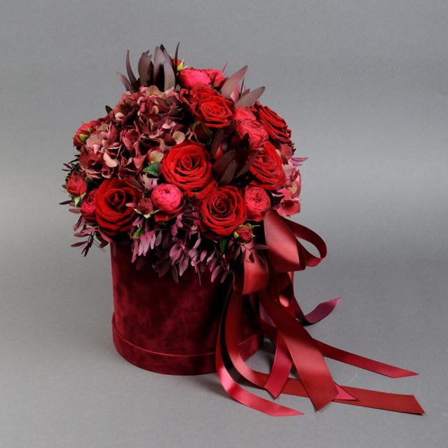 Композиція в стильній капелюшній коробці з трояндою Гран Прі, гортензією, леукадендроном, трояндою Черрі Трендсеттер та фісташкою
