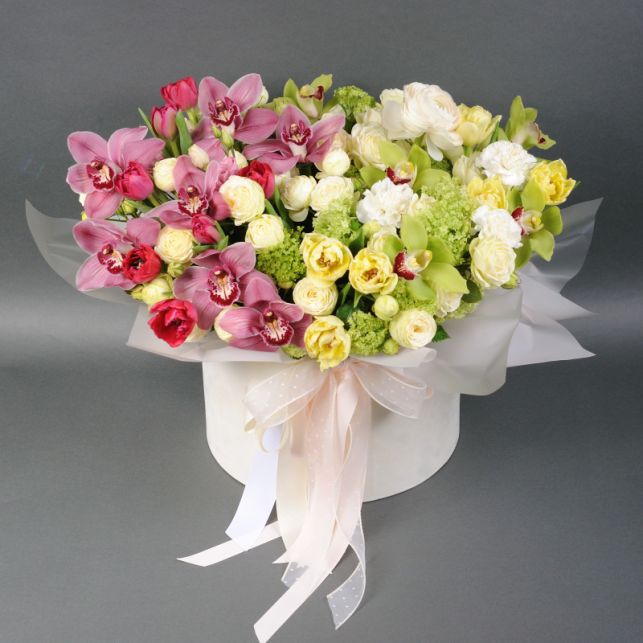 У складі композиції ви знайдете вібурнум, ранункулюс, орхідею цимбідіум, гвоздику, тюльпан та троянду - кожна квітка виражає свою неповторну красу і створює гармонійний ансамбль. Вибір цих квітів не тільки додає композиції екзотичний шарм, але і створює враження квітучого саду, що розкривається в кожному елементі.