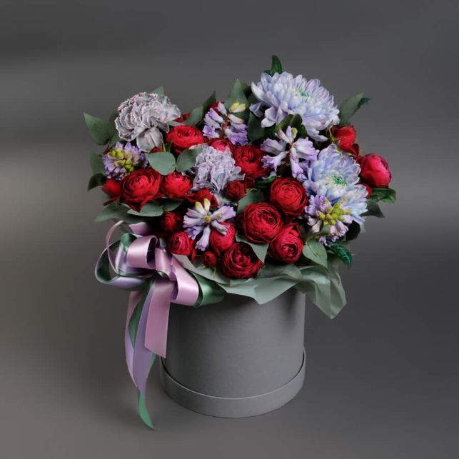 До складу композиції входить троянда спрей Черрі Трендсеттер, евкаліпт, хризантема, гвоздика, гіацинт