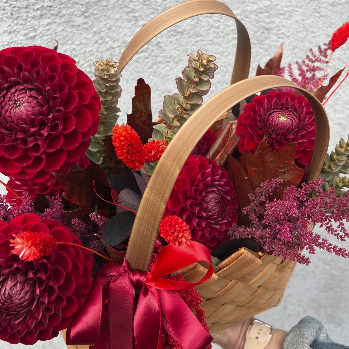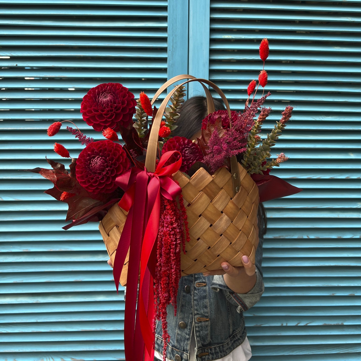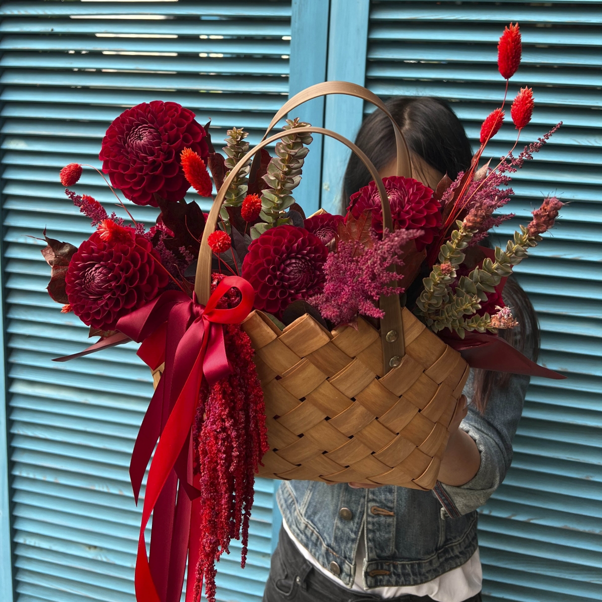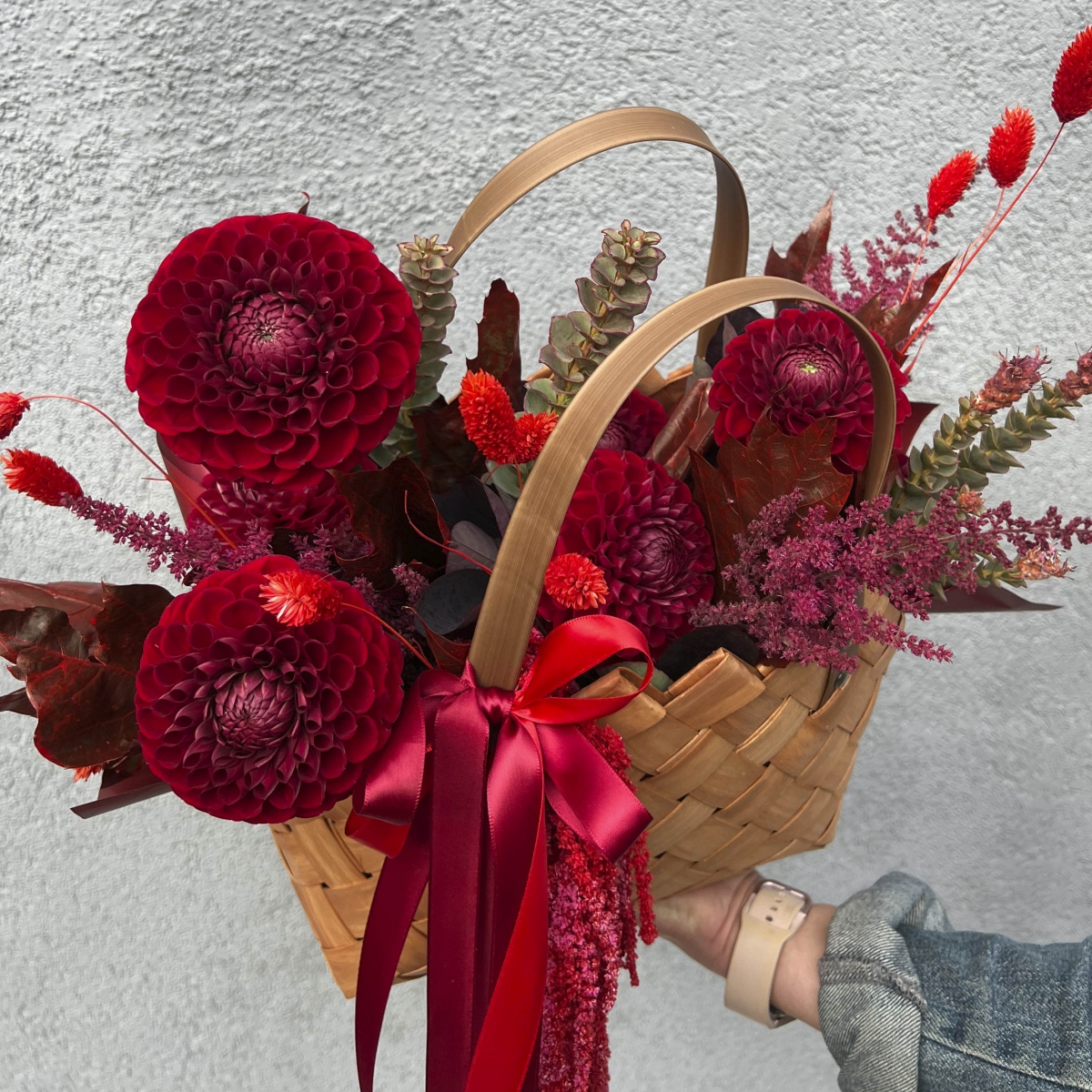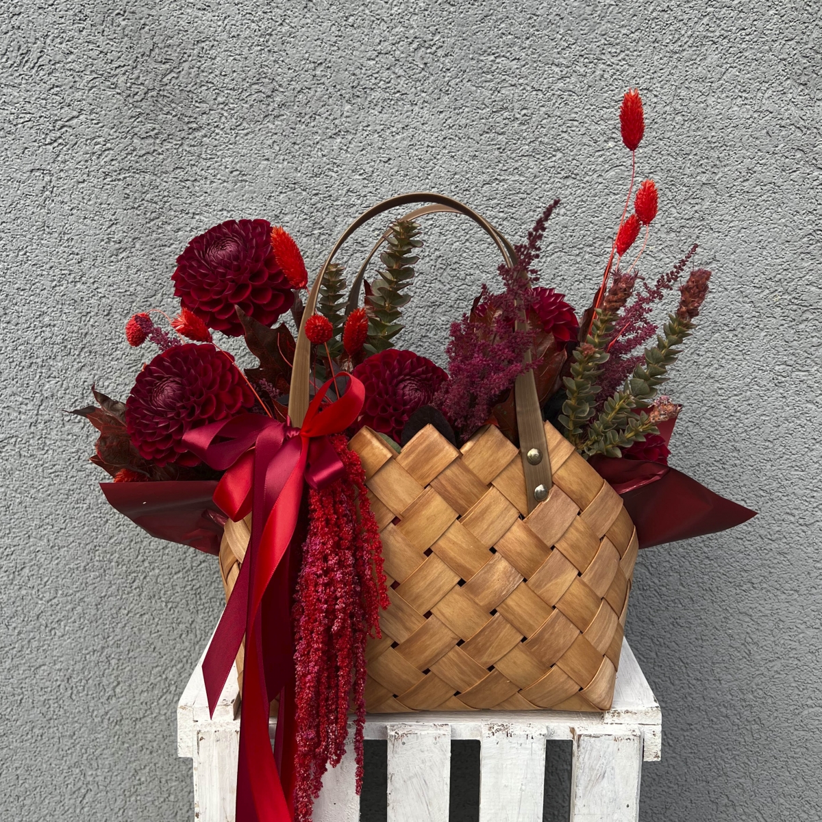 Жоржина, Астільба, Куеркус лист дуба (екіблан), Сухоцвіт Лагурус фарбований, Леукадендрон міні, Сухоцвіт Амарантус натуральний стабілізований, Котінус