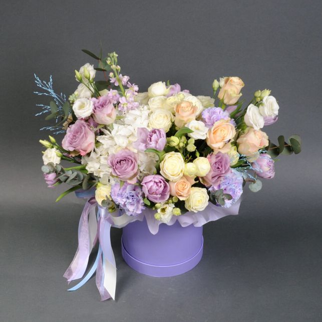 Лавандовий вечір - це не лише композиція квітів, це справжня поезія ніжності та краси, яка може оживити будь-який інтер'єр. У нашому магазині Camellia ви можете придбати цю витончену композицію, щоб подарувати себе або близьким чарівний момент затишку та гармонії. Кожна троянда Шарман та Меморі Лейн, кожен тюльпан і гвоздика - це втілення вишуканості та елегантності. А гортензія, евкаліпт та троянда спрей Сноу Волд додають композиції особливого шарму та свіжості. Придбайте композицію "Лавандовий вечір" у нашому магазині та насолоджуйтеся якістю квітів, яка подарує вам мить неповторної краси.