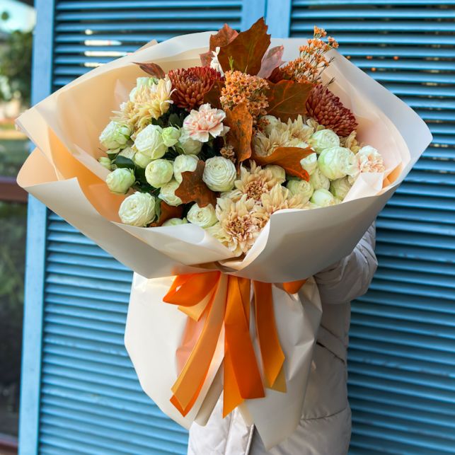 Піоноподібна троянда Сноу Ворлд, хризантема, гвоздика, хамелациум, лист дуба куеркус