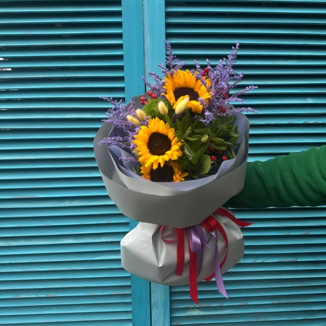 Серце букета – великі та яскраві соняшники, що символізують радість та позитив. До їх супроводу додається хіперікум, солидаго, гвоздика, фітоспорум та лагурус, які надають композиції вишуканості та оригінальності. Кожен квітка в цьому букеті – це витвір мистецтва, вирощене з любов'ю та дбайливістю.
