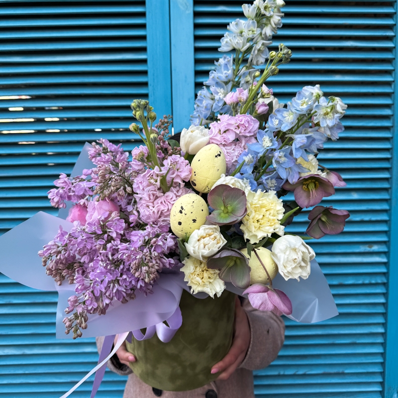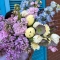 Піоноподібна троянда Лавендер Бабблз, матіола, дельфініум, бузок, хелеборус, гвоздика, тюльпан
