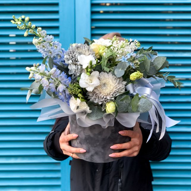 Магазин "Камелія" пропонує вам чарівну зимову композицію в капелюшній коробці, яка стане чудовим подарунком чи прикрасою для вашого приміщення. Ця композиція вражає своєю вишуканістю та неповторністю, складаючись із хризантем, дельфініуму, скімії, бузку, фрезії, еустоми, евкаліпта та оксипеталуму.